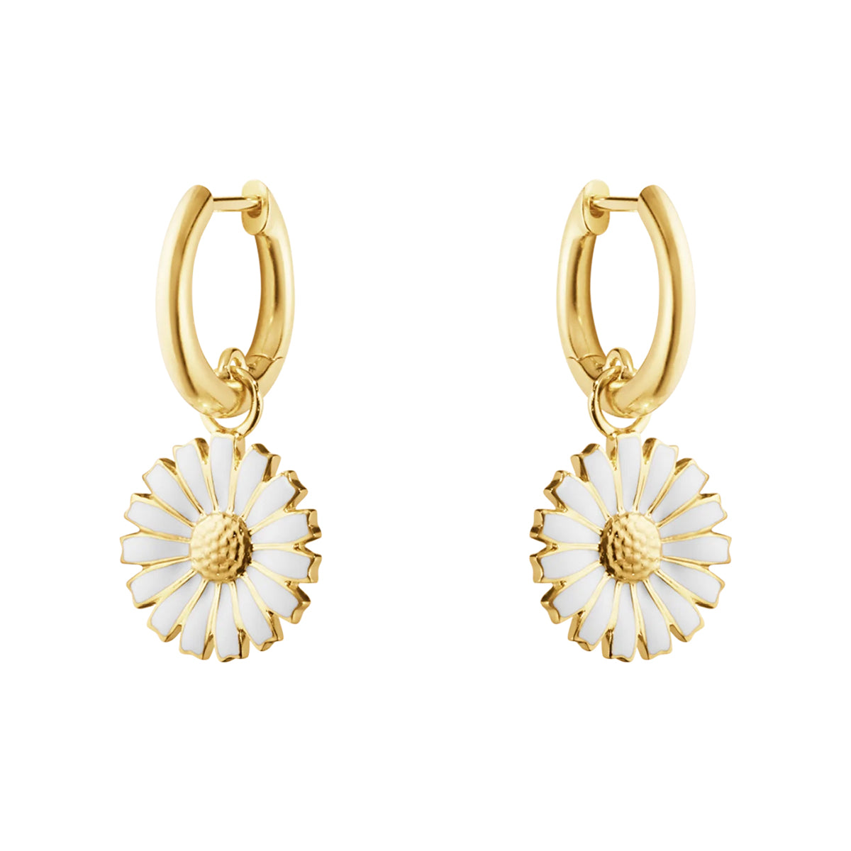 Daisy creol øreringe i forgyldt sterlingsølv med margueritter vedhæng i hvid emalje.