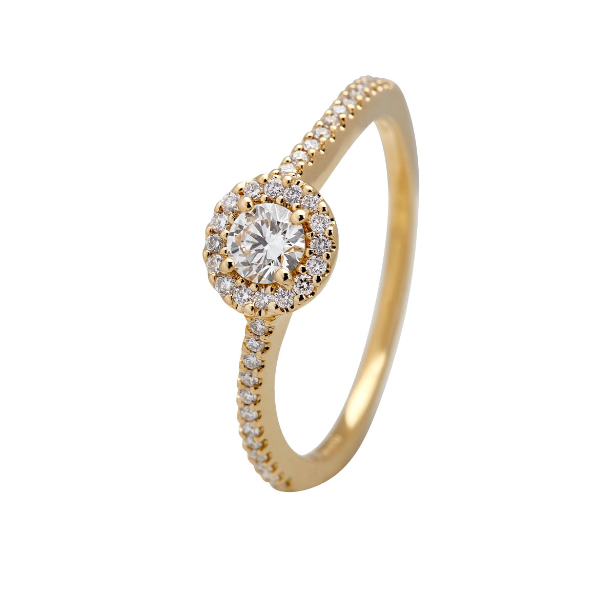 Halo, rosetring, stor model i 18K guld med I alt 0.43 ct. T.W/W.SI brillanter.