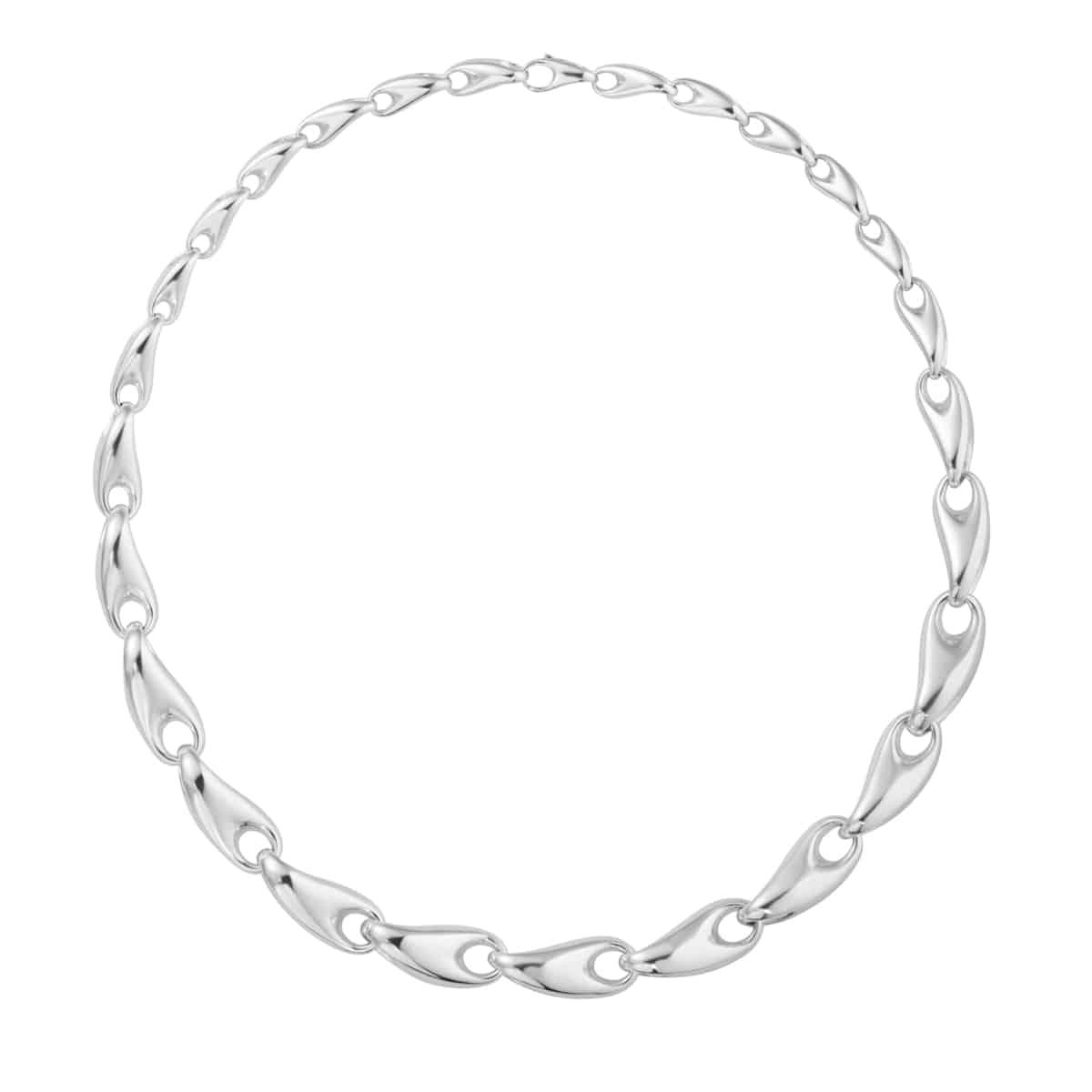 En serie sammenflettede led i sterlingsølv, der gradueres fra små bagpå til større foran, er sat sammen for at skabe en helt ny fortolkning af den traditionelle halskæde. Dette betagende statementsmykke designed af Jacqueline Rabun kombinerer et dristigt look med Georg Jensens skulpturelle designsprog og er fastgjort med en integreret lås.