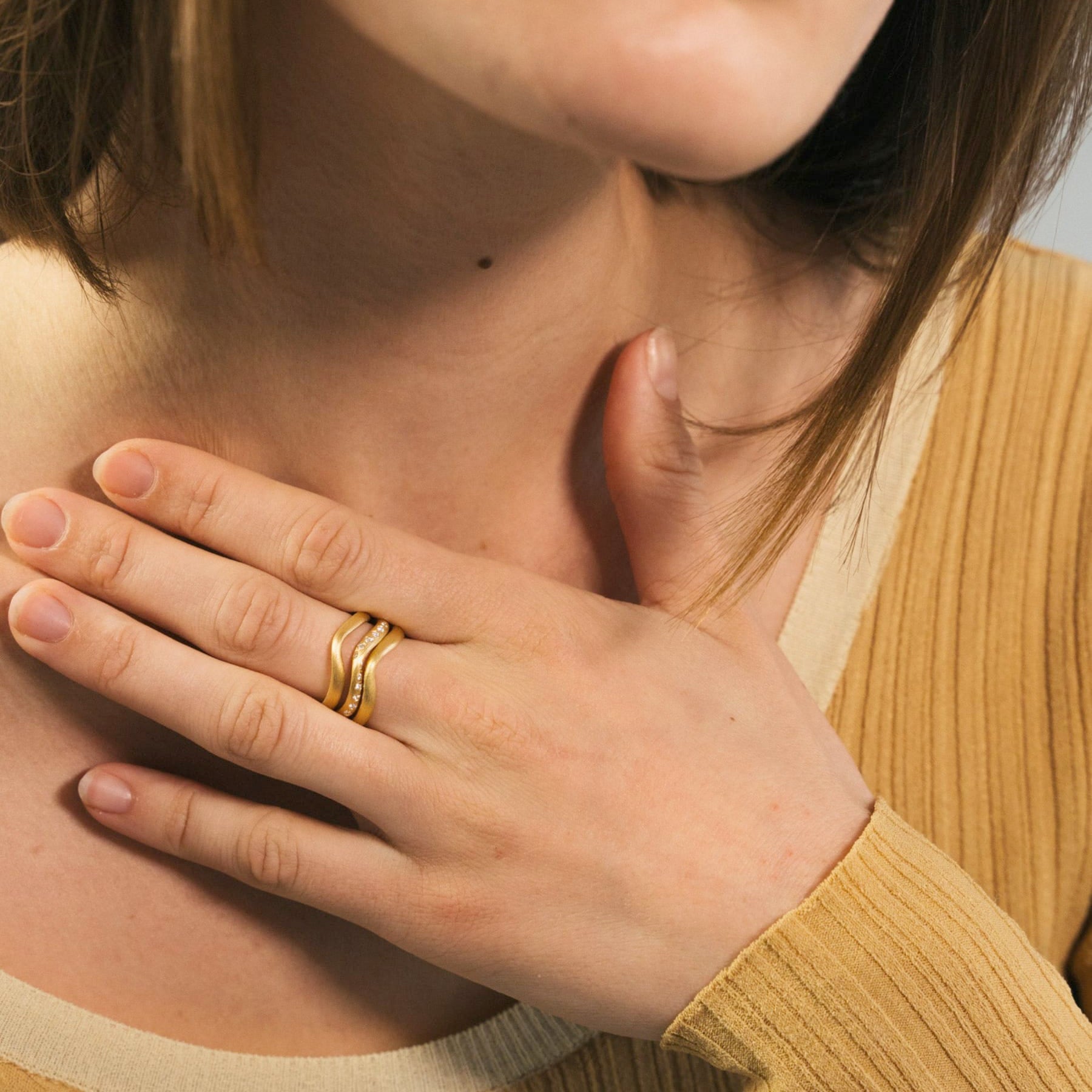 Navnet VEGA udspringer af kreativitet, modernitet og fleksibilitet, hvilket er essensen af denne kollektion, som består af ringe og et armbånd i silkemat guld designet i visuelt flydende bevægelser. De lette ringe giver med deres organiske form et forskelligartet look alt afhængig af, om ringen sidder alene eller sættes sammen med flere VEGA ringe. Mixer man ringene med og uden brillanter opnås et nyt udtryk i bevægelse og samspil.
